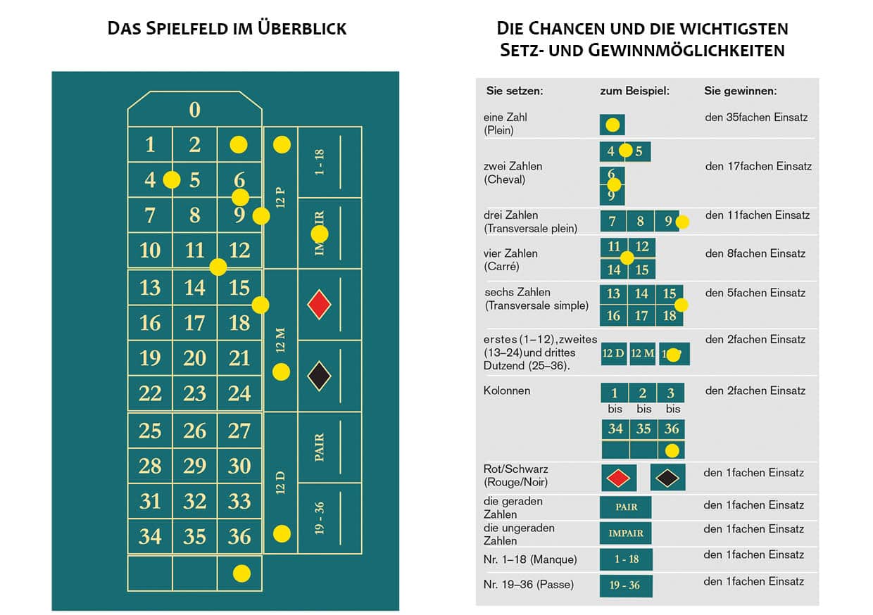 Der Spieltisch: Der Spieltisch besteht aus dem Roulettekessel und dem Spielfeld, Tableau genannt. Im Roulettekessel befinden sich 37 Felder mit den Zahlen 0 bis 36. Die Anordnung der Zahlen ist in unregelmäßiger Reihenfolge. Die Zahlen 1 bis 36 sind abwechselnd rot oder schwarz markiert. Nur die Zero („0“) steht auf grünem Feld. Auf dem Tableau sind die Zahlen numerisch angeordnet, umgeben von einer Anzahl Setzfeldern in verschiedenen Größen.